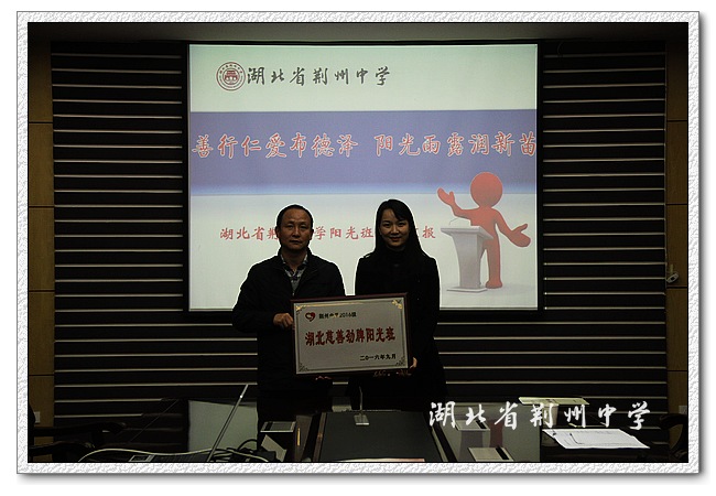 最后,郭细萍副会长为我校2016级劲牌慈善阳光班授牌,孙振华主任为我校2016级劲牌慈善阳光班赖锋利老师颁发了阳光班班主任聘书。