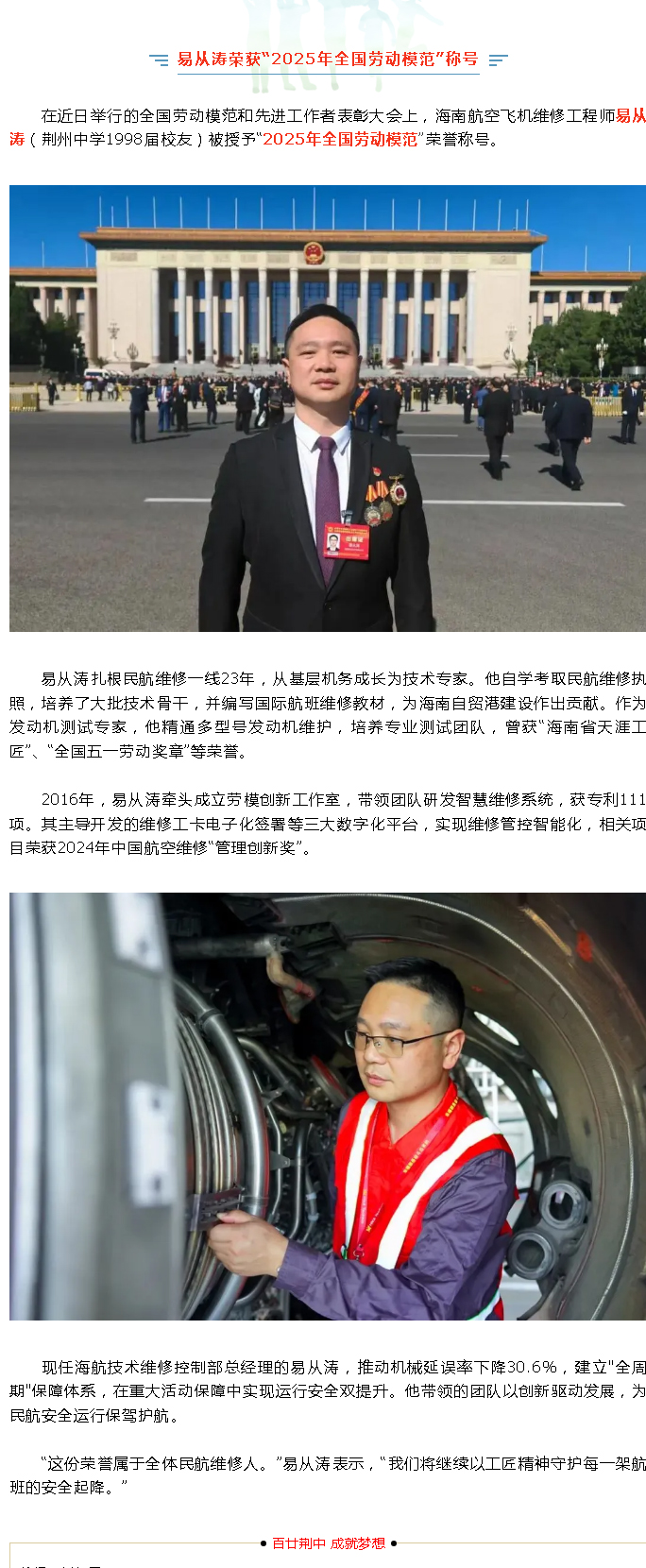 【校友】易从涛荣获“2025年全国劳动模范”称号