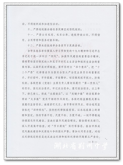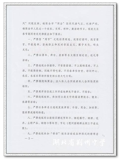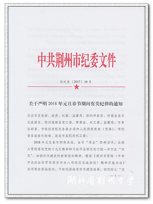 2018年元旦春节即将来临,全市“两会”即将召开。为深入贯彻落实党的十九大精神和习近平总书记关于进一步纠正“四风”、加强作风建设的重要指示精神,推进《荆州市贯彻<中共中央政治局贯彻落实中央八项规定实施细则>精神实施办法》各项要求落地落实,不断巩固拓展作风建设成果,切实防止“四风”问题反弹,确保全市“两会”期间风清气正、纪律严明,确保全市人民过一个欢乐、文明、祥和、廉洁的节日,现就元旦春节期间有关纪律提出如下要求: