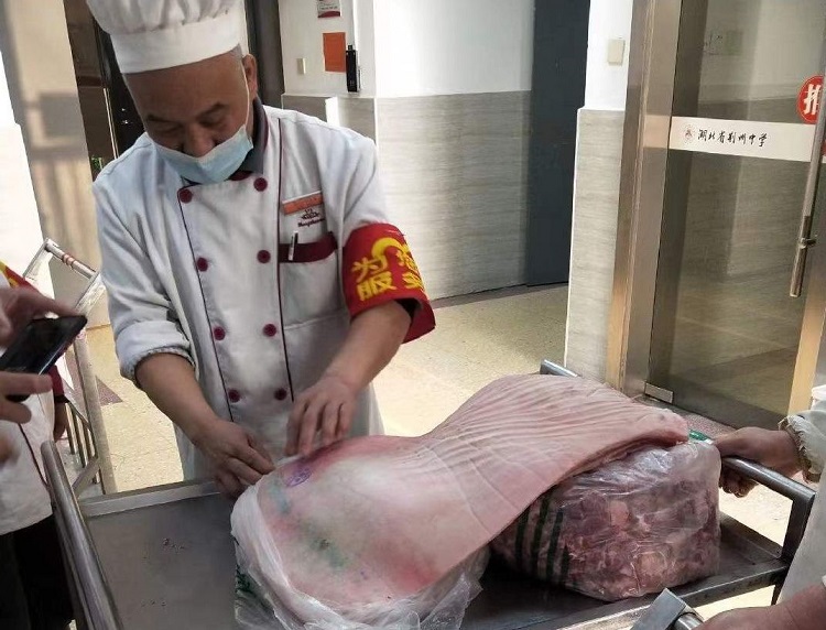 早上8点,检查人员在学校食堂门口集合,在食堂负责人带领下,所有人检查了食堂主食库、副食库、蔬菜储藏处,并查验当天猪肉、牛肉等肉制品的品相,选取蔬菜样品现场进行农药残留检测。