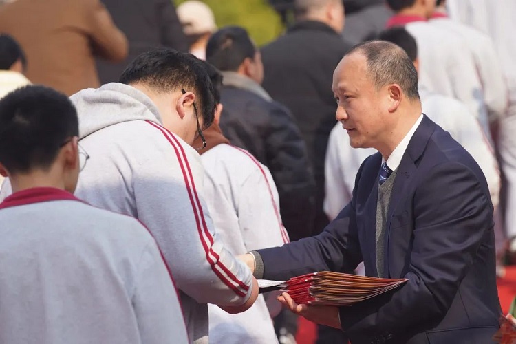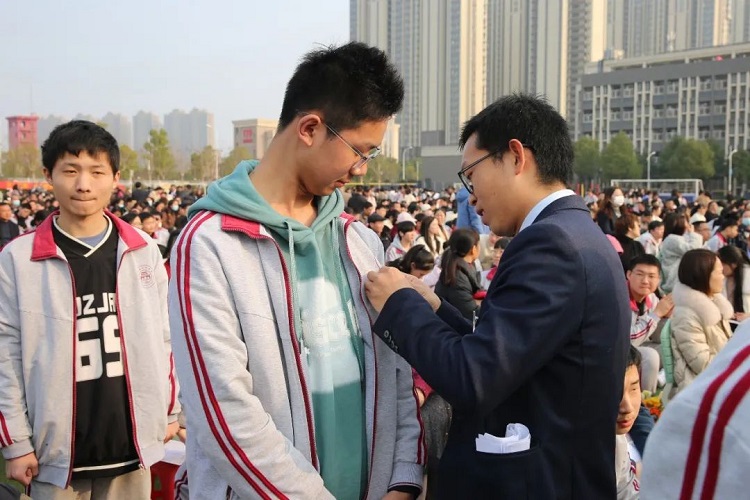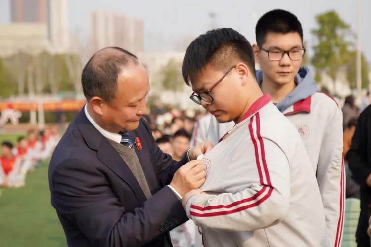 党委书记、校长朱胜祥为学生佩戴“9323彩票2023高考必胜胸牌”。