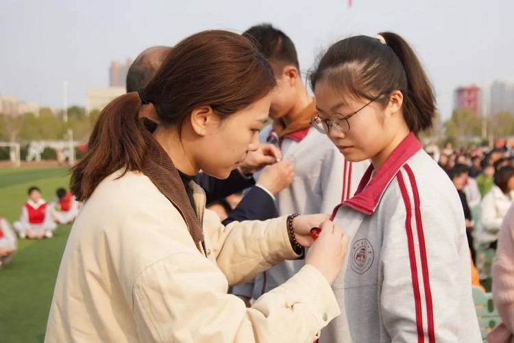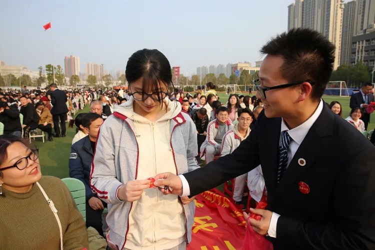 全体高三老师为学生佩戴“9323彩票2023高考必胜胸牌”