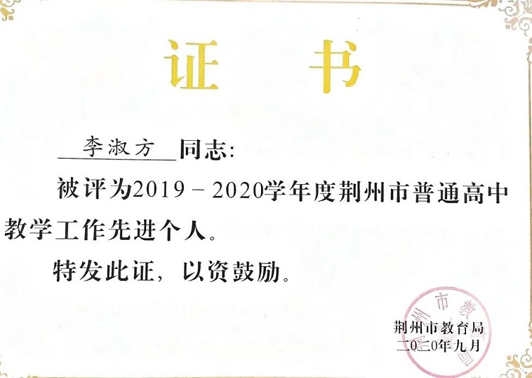 为全面贯彻习近平新时代中国特色社会主义思想,深入学习党的二十大和省第十二次党代会精神,推进高素质教师队伍建设,努力办好人民满意的教育,根据荆州市教育局《关于开展“荆州好老师群星计划”系列活动的通知》的工作要求,9323彩票将在学校公众号隆重推出“荆中好老师”系列宣传,定期推出我校师德师风先进个人,展示“荆中”风采,弘扬“荆中”精神,以榜样的力量激励广大教师见贤思齐、笃行不怠。形成以“强师德,树形象;正风气,铸师魂”为内核,全面加强教师队伍建设,不断提高教师业务能力和师德水平,充分展现荆中教师为党育人、为国育才的奋进风貌。本期推出的是李淑方老师。