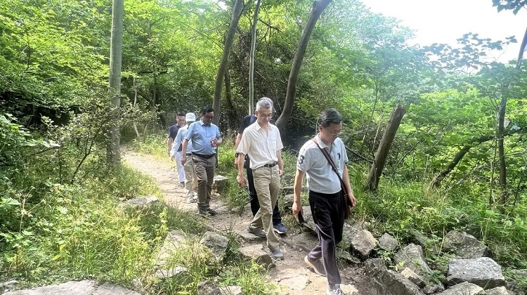 呼吸着山间清新的空气,饱赏着满眼错落的绿色,不一会儿,校友们就来到了此次徒步的险绝之处——幽栖古道。在古道上,校友们畅谈眼下美景,也互相交流着各自的工作和生活,谈笑之间,校友们的情谊变得更加坚固,未来可预期的合作和交流也愈发清晰。