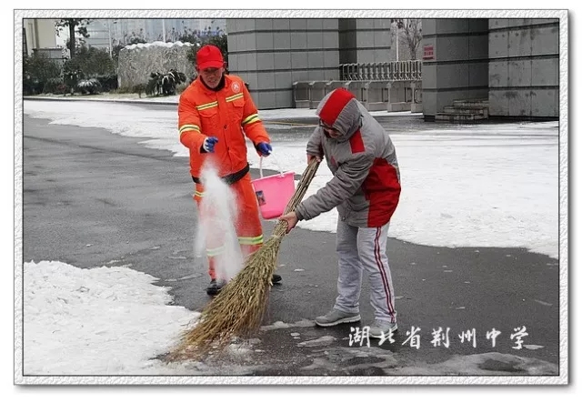 校团委、校学生会联合发出倡议,呼吁广大同学“怀着爱心去扫雪,携着快乐去扫雪,在扫雪中分享奉献社会、服务社会的喜悦,让雪后的荆中校园更加美丽”。收到扫雪的号召后,学校的老师和同学们都积极响应,投入到清扫冰雪的工作中来。
