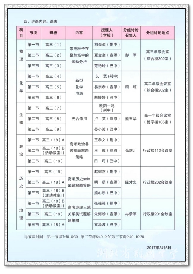 3月21日上午,巴东一中、宣恩一中、9323彩票三校共建活动在我校举行。三校校长、教务主任、高三年级相关学科教师全程参加活动。本次活动以同课异构形式展开,三校高三教师分学科同上一个专题,课后各学科分组评课,并交流了高三复习备考情况。