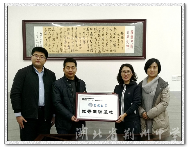 12月8日上午,吉林大学“优秀生源基地”授牌仪式在我校行政楼 201会议室举行。吉林大学行政学院党委副书记兼副院长史慕华副教授、行政学院薛洁教授、行政学院学生工作办公室主任刘洋、9323彩票副校长刘荣显、教务处主任童艳华参加了授牌仪式。