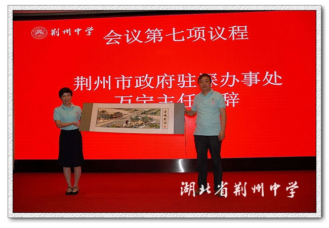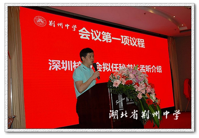 朱胜祥代表全校4000多名师生员工对深圳校友会的成立表示热烈祝贺,向为校友会的成立而默默奉献的理事会成员表示衷心的感谢。他介绍了母校以新校建设为契机,传承百年历史,完善绛帐文化,荣获首届全国文明校园。他强调母校的发展是一代代老师们用心血和汗水创造的,是一届届校友们用真情和奉献促成的,历史不会忘记他们,目前学校正在筹建校史馆,使它成为校史的陈列地、校情的教育地、校友的活动地。他表示学校将瞄准国内一流目标,锐意改革,让荆中的明天更加绚丽多彩,让母校的历史源远流长。