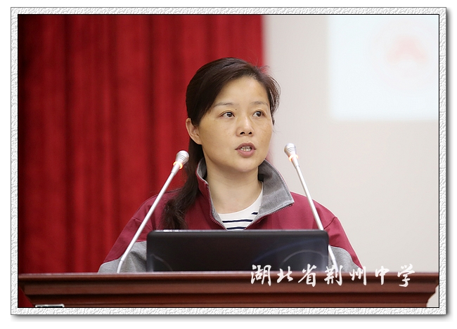 物理教研组长孔晓蓉上台发言,她先谈到同学们学习物理的四种表现,然后从物理的学科意义与如何学好物理两个方面与同学们分享交流。