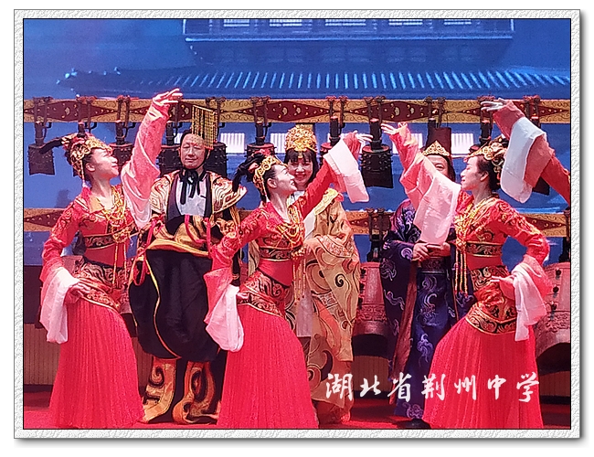 《楚宫乐舞》分为楚乐迎宾、橘颂、高山流水、荆楚八音四个环节,最后,表演现场还邀请观众上台互动,我们的胡文汇老师被选为楚王的扮演者,穿上华丽的楚王服饰,将现场气氛推向高潮。