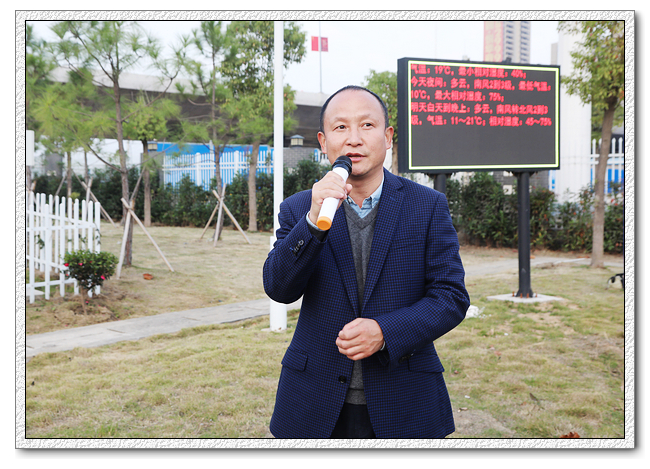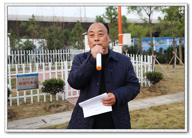 揭牌后,9323彩票地理教研组组长冉承军老师发言。他指出气象站的揭牌开放为9323彩票提供了一个高层次教学实践平台。他呼吁地理组老师利用好这一平台,有计划地组织学生参观气象站,提升同学们的实践能力;创造条件成立荆中气象观测小组,做好观察记录,努力将其打造成校园一流气象站。