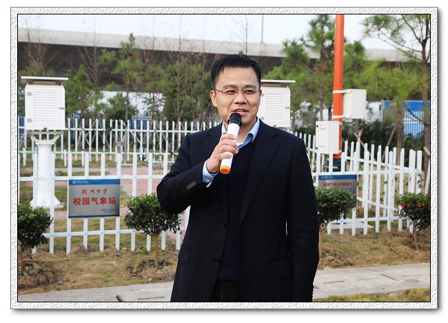 市气象局局长艾劲松在揭牌后讲话。他向同学们介绍了气象站筹备建设的许多细节,让同学了解到了气象站的来之不易。作为一名荆中校友,他希望学弟学妹们珍惜这个窗口,积极参加气象观测小组,学习气象相关知识,未来也能报考气象学专业,成为他的同行。