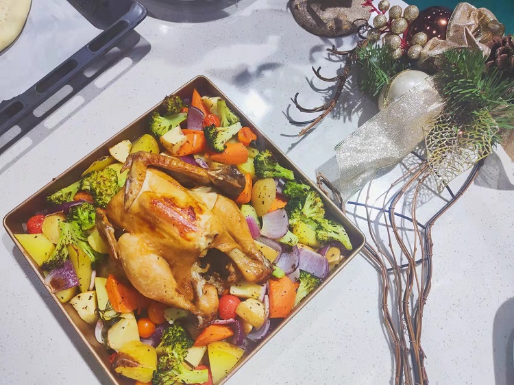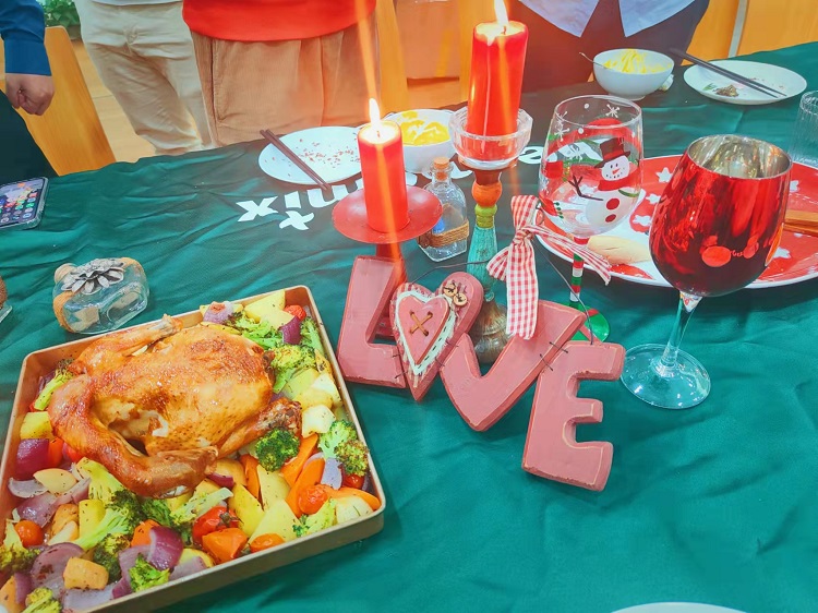 香草鸡,披萨,果香热红酒,奶油南瓜浓汤,水果沙拉,紫米蛋糕,姜饼人糖霜饼干等。